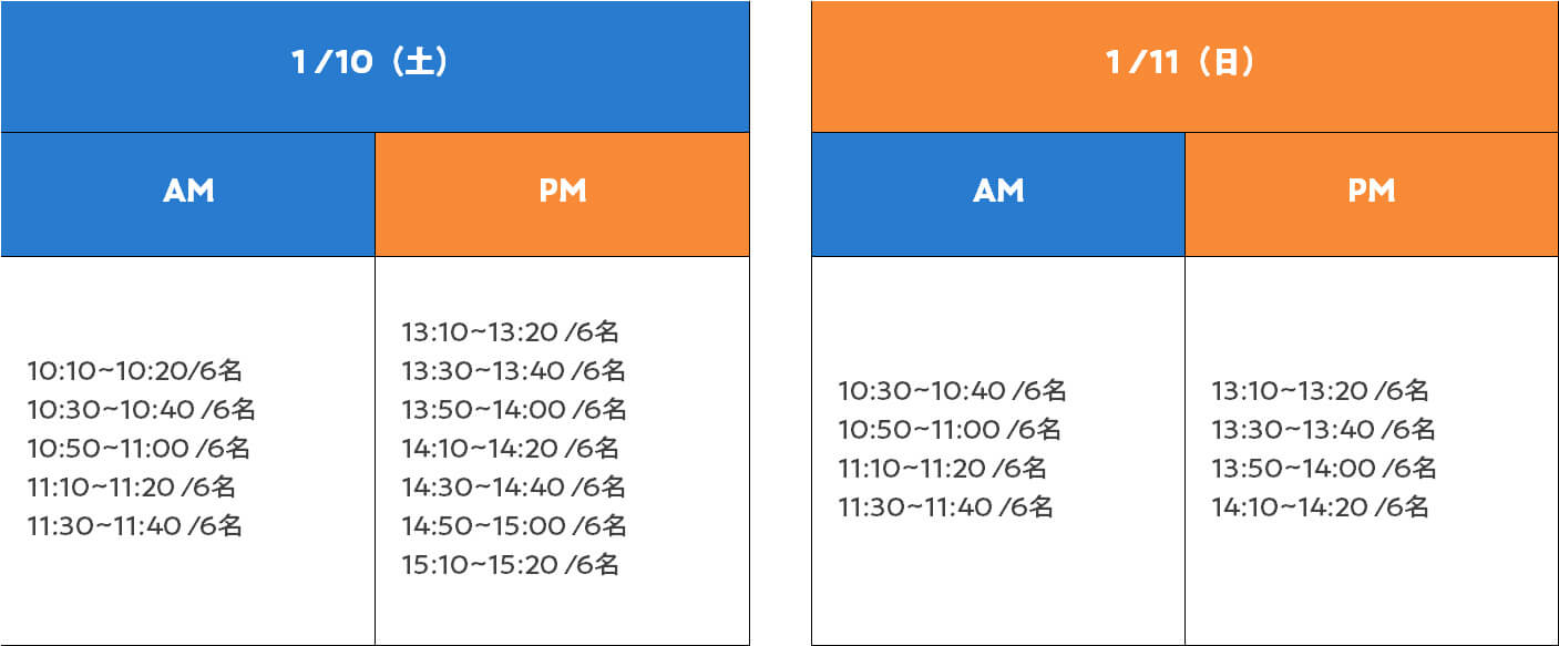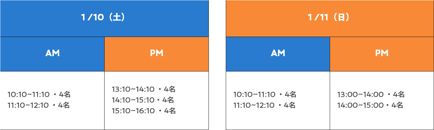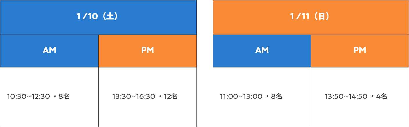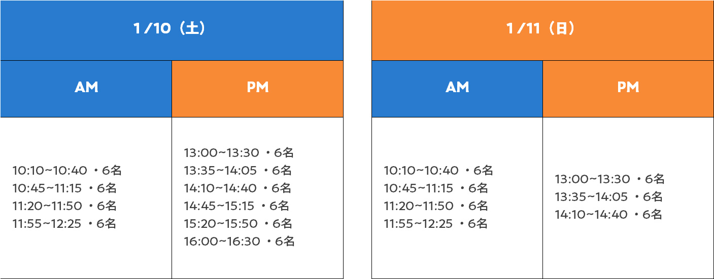 - 定員:10日午前6名・午後6名、11日午前6名・午後3名